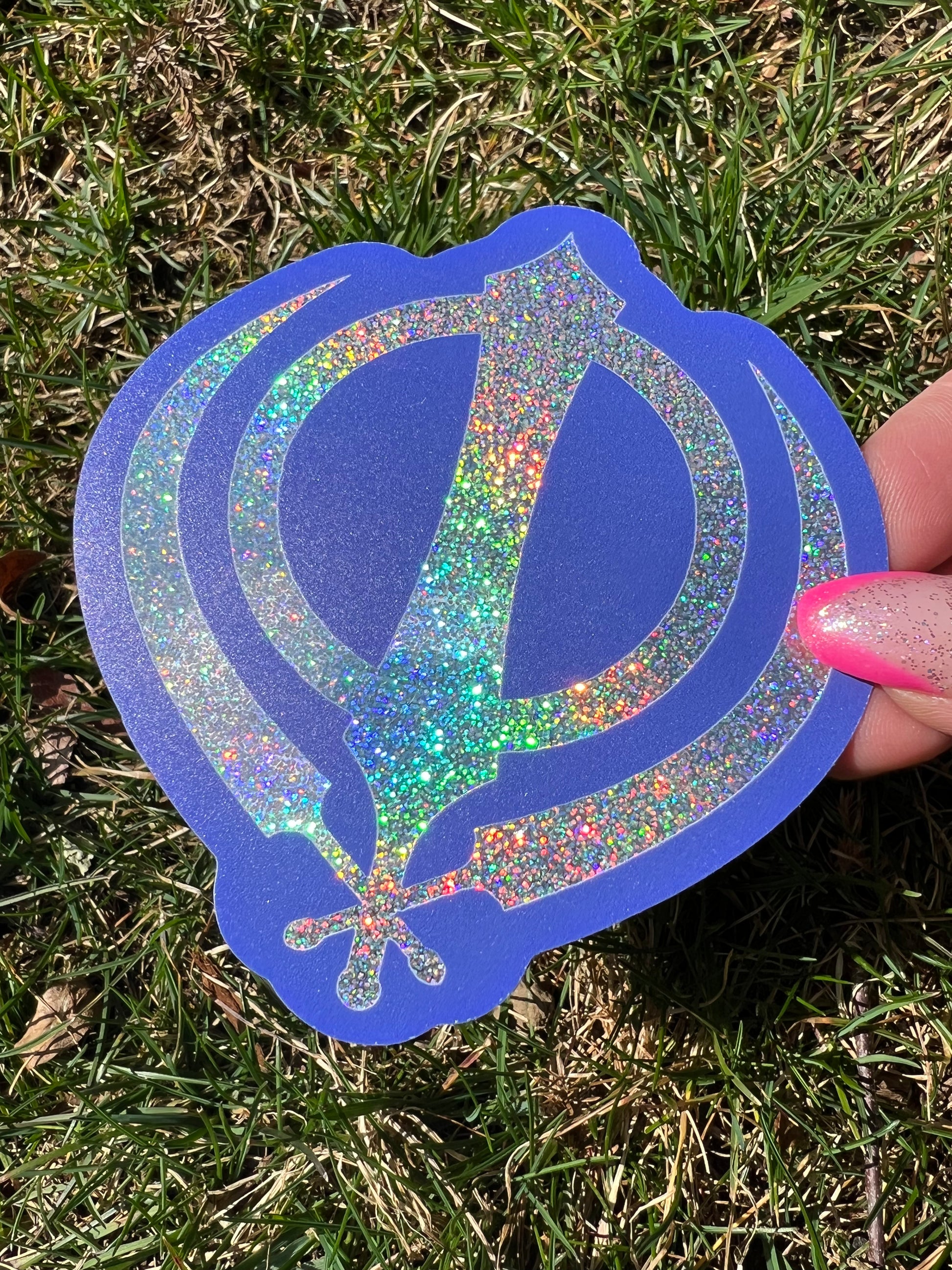 The Adi Shakti symbol of creation With lots of holographic glitter outlined in royal blue.