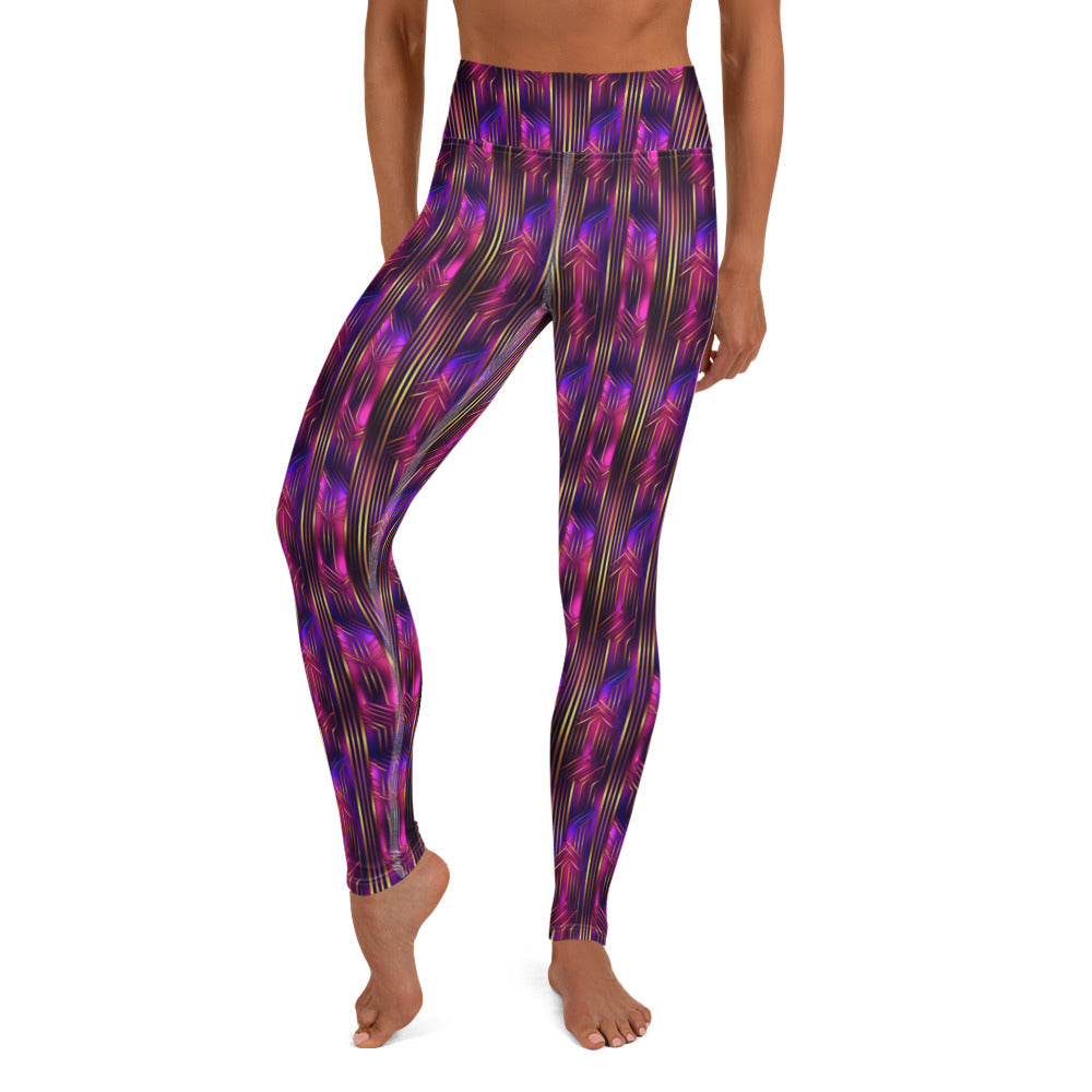 Frequency Flow. Inspired by the beautiful patterns of art deco and neon lights. These leggings with a dynamic print adds a touch of excitement that captures the essence of frequency, vibration, and sound. Dive into a world of rhythmic movement with this stunning print that radiates energy and style.