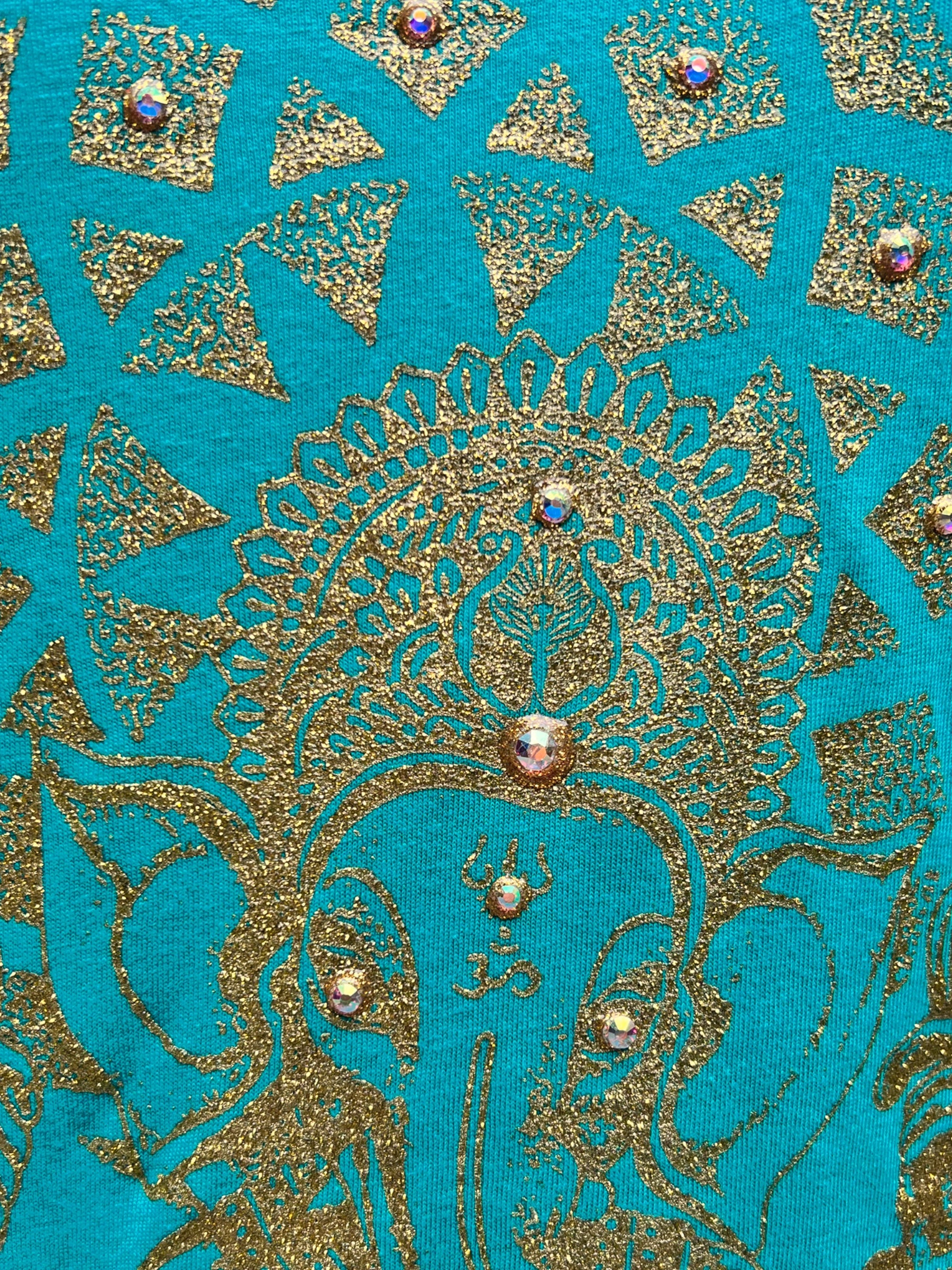 He is ALL GOLD glitter. Adorned with lots of aurora borealis multicolored RHINESTONES.