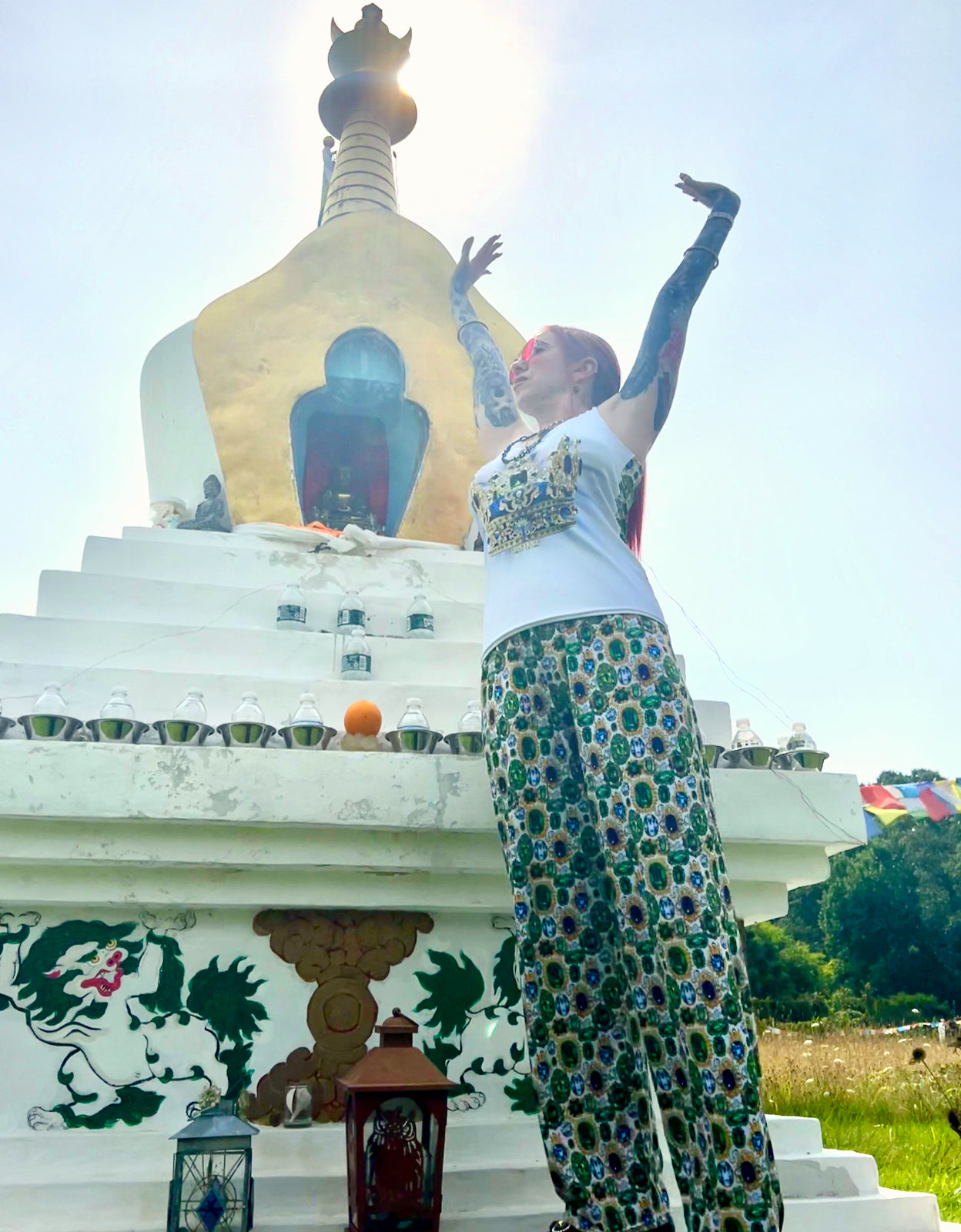 Elevate your style with our gem-print pants, a vivid expression inspired by the profound teachings of Kundalini Yoga – a Raj (Royal) practice that bestows sovereignty and reverence through ancient lineage.