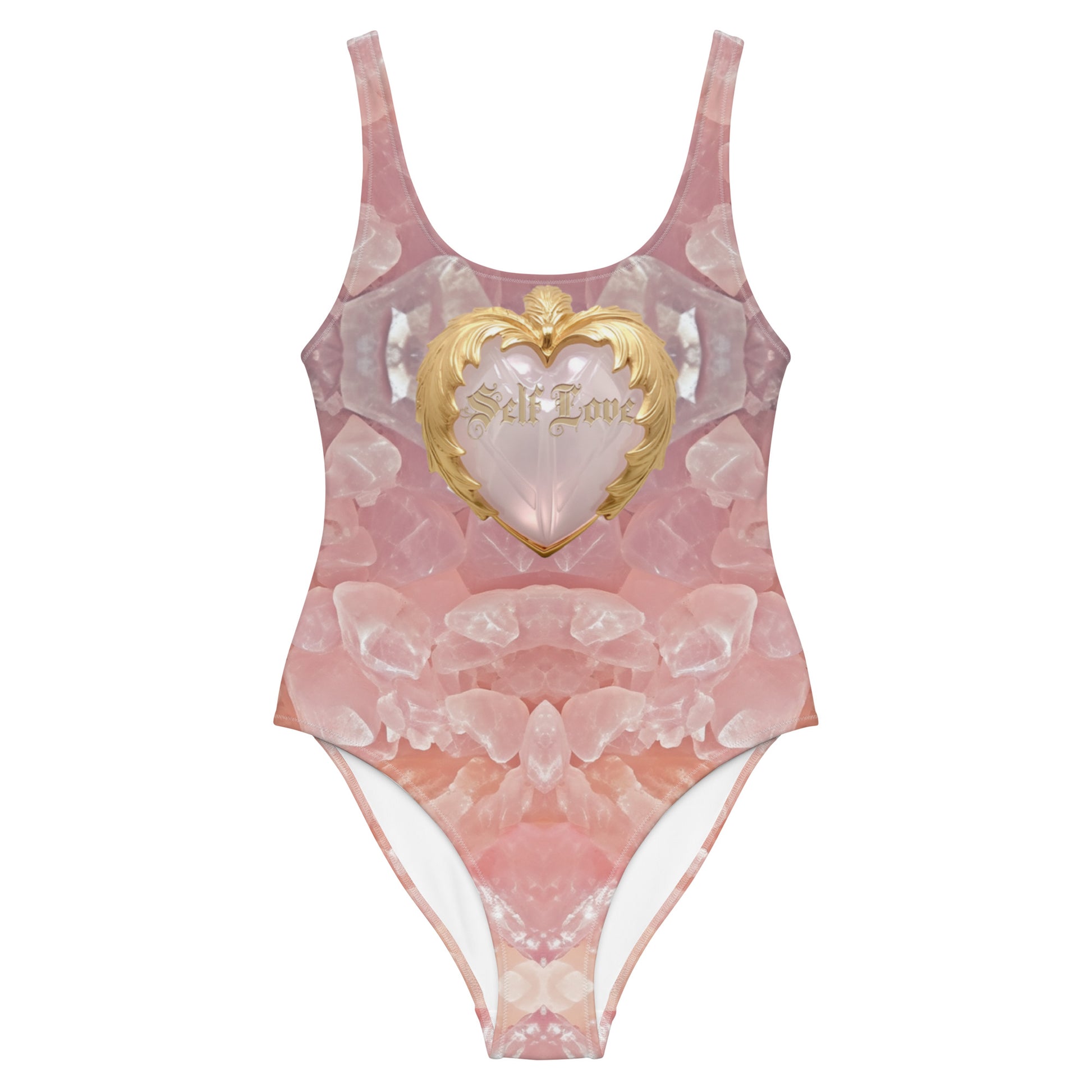 Indulge in the radiant beauty of our exquisite one-piece swimsuit, adorned with a mesmerizing rose quartz print that evokes the essence of compassion and love. Featuring a stunning rose quartz and gold baroque heart embellished with the empowering words 'Self Love,' this swimsuit serves as a constant reminder to cherish and nurture yourself.